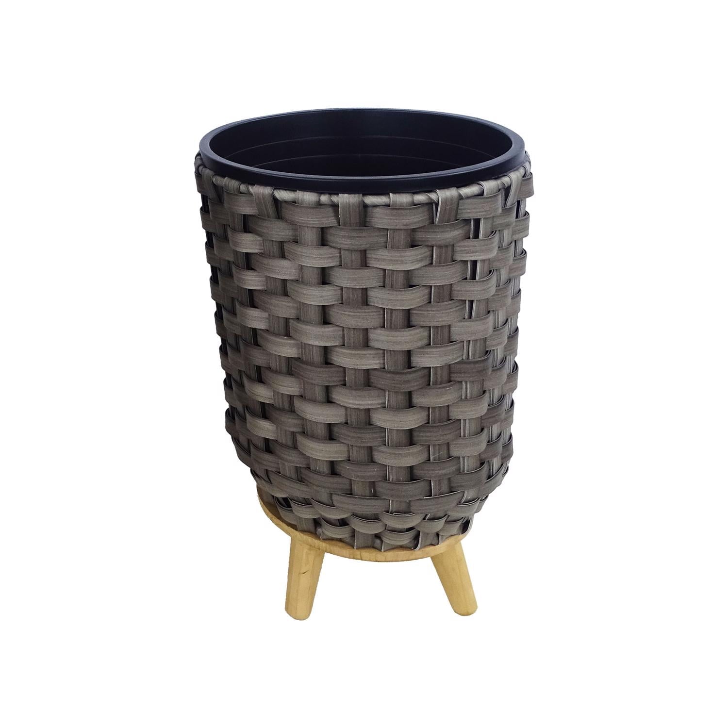 The Basket with a wood stand and inner black plastic Liner is designed to bring nature indoors with a touch of elegance. Measuring 10 inches in length, 10 inches in width, and 13 inches in height, or 16 inches with the included legs, this planter seamlessly combines style and practicality. The fusion of natural materials creates a visually appealing design that complements various interior aesthetics. The texture, combined with the stability of the wood stand, offers a harmonious balance between beauty and function. Designed for convenience and protection, the Inner Black Plastic Liner prevents spills. Cleaning is effortless, ensuring the planter remains in top condition. With a loading capacity of 20 pounds, this small planter accommodates a range of plants, adding a touch of greenery to living space. Its 6-liter volume provides ample room for plants to thrive. Whether placed indoors or on a balcony, the Small Planter seamlessly blends natural elements with modern design, enhancing surroundings with a touch of sophistication.