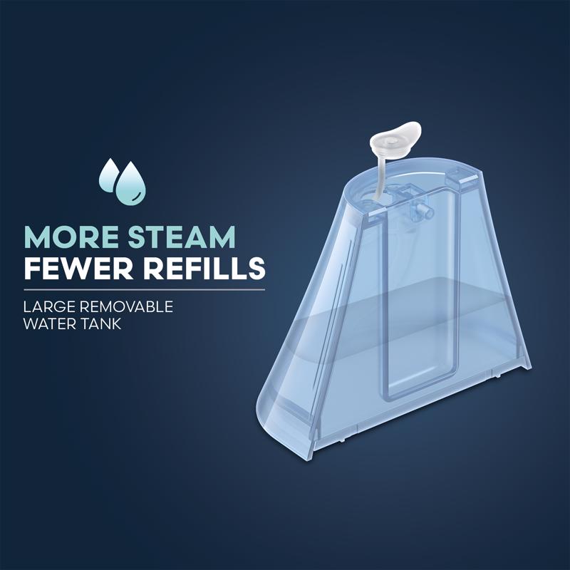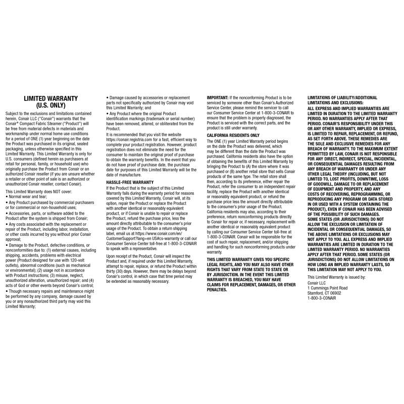 The CompleteSteam Compact Steamer by Conair offers a faster, easier, and lighter alternative to traditional ironing. With a rapid 30-second heat-up time and high velocity continuous steam, it quickly eliminates wrinkles while being safe for all fabrics. Its compact, ergonomic design and removable 4.7 fl. oz. water tank make it ideal for everyday use or travel. Designed for convenience, this steamer features an 8 ft. power cord, power/ready lights, and includes a bonus brush attachment for added versatility.