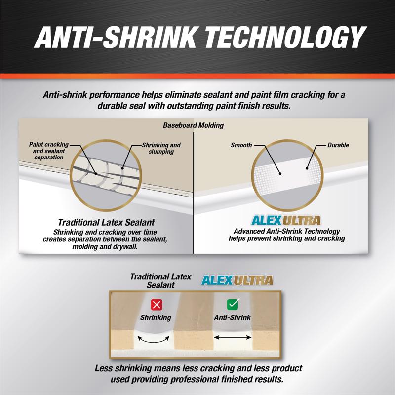 Alex Ultra Advanced Latex Sealant is a high performing acrylic latex sealant that offers exceptional performance for the Pro Painter. With Anti-Shrink technology, it is designed to shrink less, creating a more durable long-lasting seal that won't crack after painted. It can be brush painted in just 15 minutes after application or spray painted immediately for improved productivity. This low shrink, durable, flexible sealant applies smoothly & easily, is low in odor, and doesn't pick up dirt.