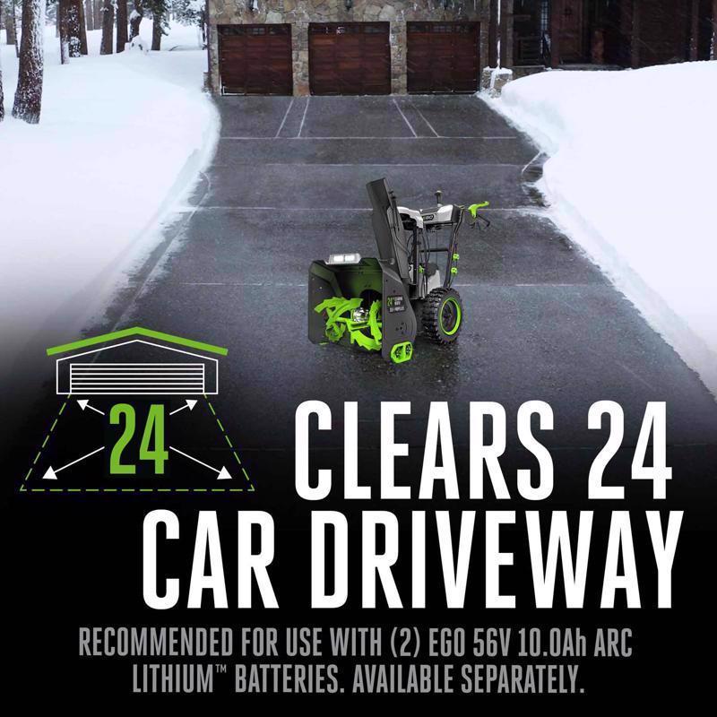 The EGO POWER+ 24 in. Self-Propelled 2-Stage XP Snow Blower with Peak Power exceeds the power and performance of gas without the noise, fuss, and fumes. This 24-inch two-stage snow blower features heated handle grips to help keep your hands warm in the coldest, snowiest conditions and trigger-controlled steering assists with turning for more control. Its handle-mounted 2-in-1 chute adjustment lever directs and deflects snow where you need it with 200-degree directional control for efficient snow removal. With Peak Power+ technology, this cordless snow blower combines the power of any two EGO 56V ARC Lithium batteries to churn through the toughest snow conditions and what the snowplow leaves behind with ease and throws it up to 50 feet. Clear a 24-car driveway with 8 inches of snow on a single charge when used with two recommended 10.0Ah ARC Lithium batteries (available separately). Get the job done easily with variable-speed self-propelled forward and reverse directions and four LED lights for added visibility in early morning or evening. Experience Power Beyond Belief with the EGO POWER+ 24-Inch Self-Propelled 2-Stage XP Snow Blower with Peak Power and the entire EGO POWER+ lineup.