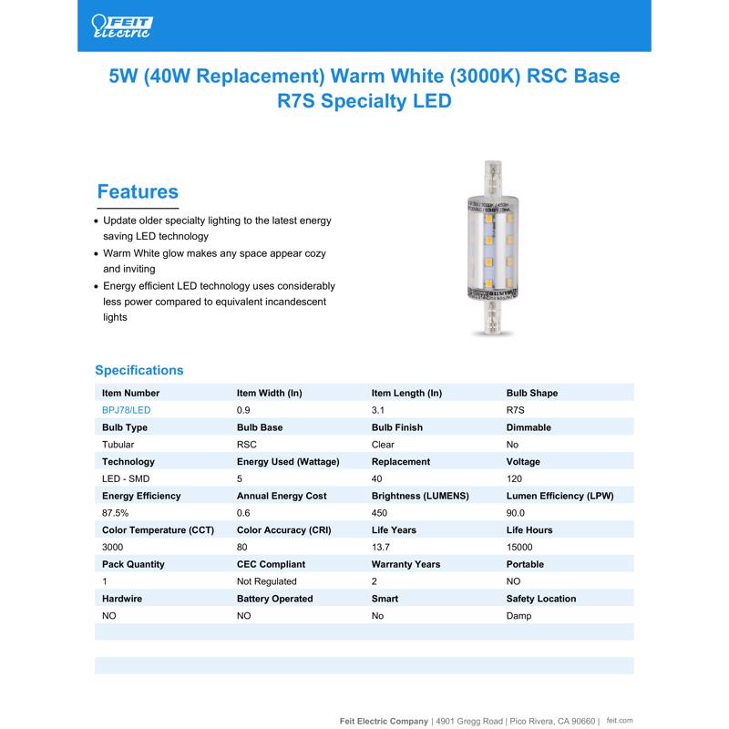 Feit LED Specialty R7S R7 LED Bulb Warm White 40 Watt Equivalence 1 pk (BPJ78/LED)