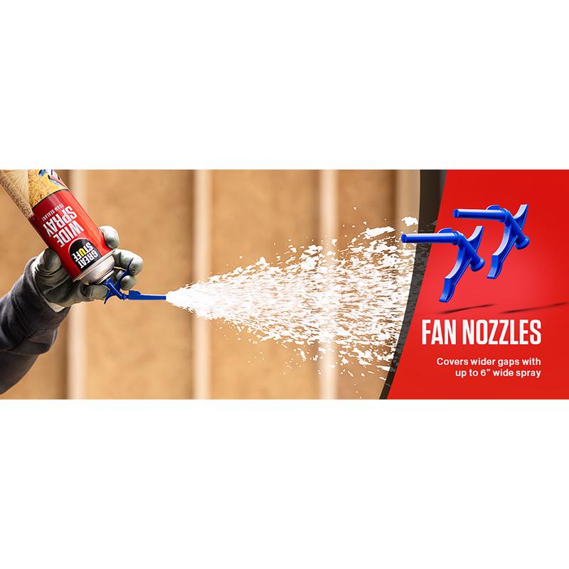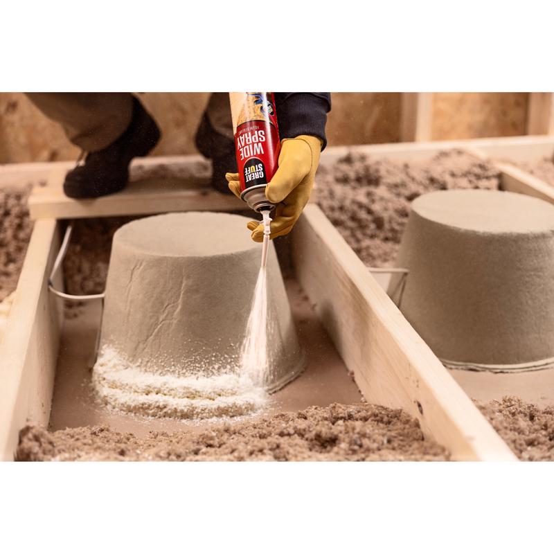 Great Stuff Wide Spray is a closed cell insulating foam sealant that coats and air-seals seams, joints, large gaps, and irregular surfaces (up to 6 in. wide). Wide Spray provides broad coverage, fast application and reach, allowing for rapid air sealing over large surfaces, in tight spaces, hard-to-reach areas, and adheres to vertical and horizontal surfaces. Wide Spray comes with two 18oz cans and can cover up to 60 linear ft. (at a 4 in. wide band). The 1-component formulation means no mixing and requires no respirators or coveralls while spraying. Great Stuff Wide Spray expands to take the shape of cracks and voids and forms a durable, airtight and water-resistant bond that eliminates unwanted airflow and helps reduce condensation.