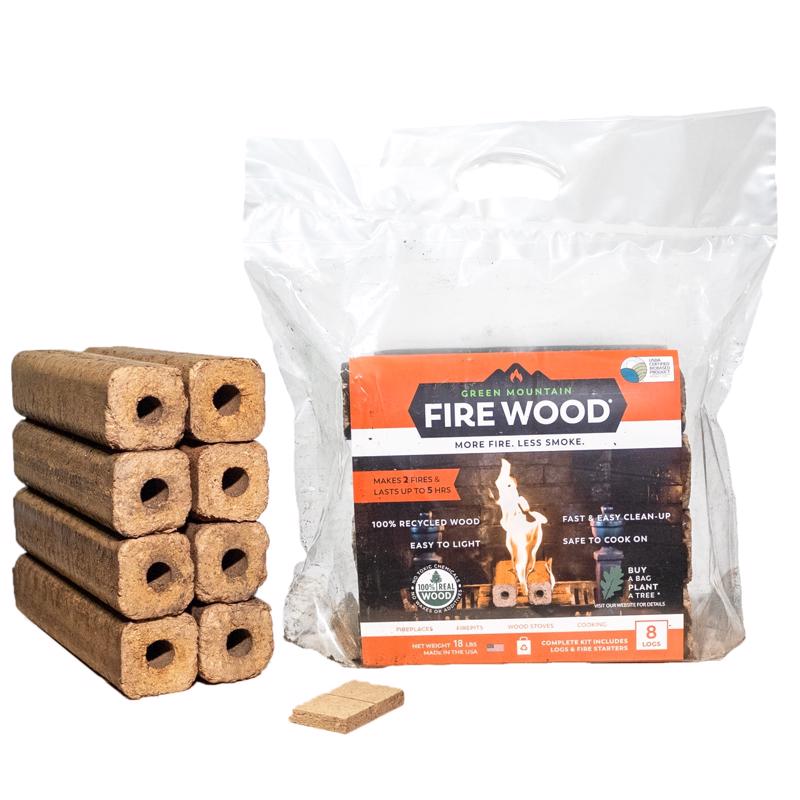 Green Mountain Firewood logs are made entirely of aromatic sawdust, shavings and wood chips, compressed and extruded into a convenient size. Portable and compact for road tripping.