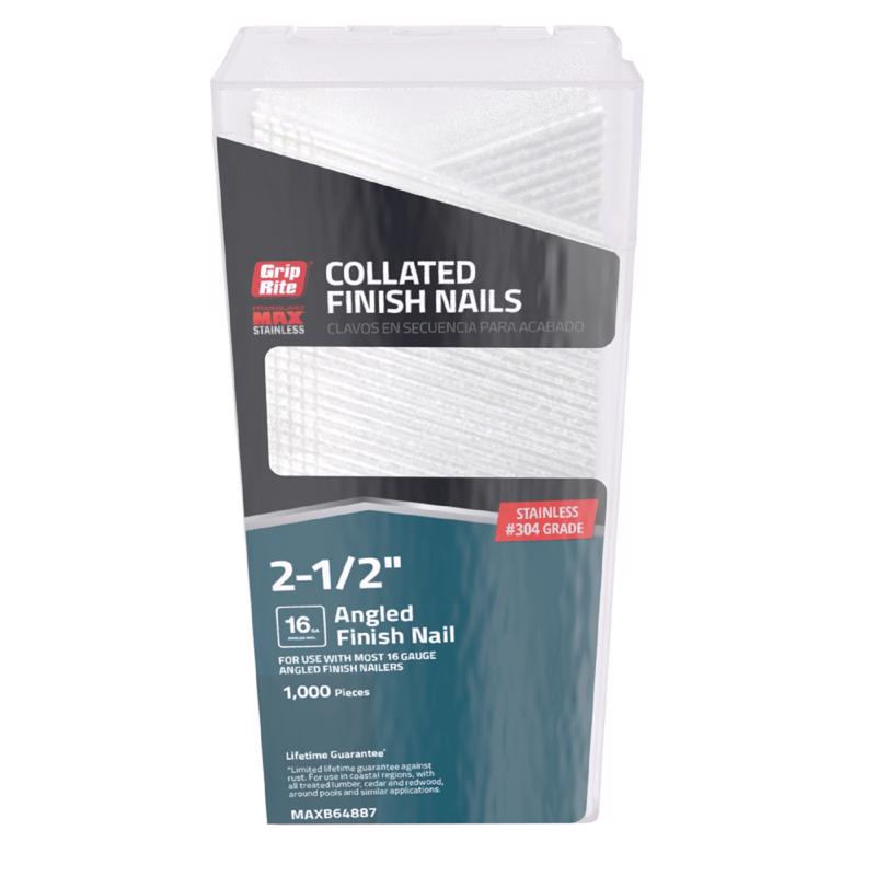 Grip-Rite 16 Gauge Angled Finish nails are best suited for any interior finish application. The nails have a bright finish, are constructed of 16-gauge steel, and are collated with an adhesive. All Grip-Rite collated nails are backed by the Grip-Rite Jam-Free Guarantee.