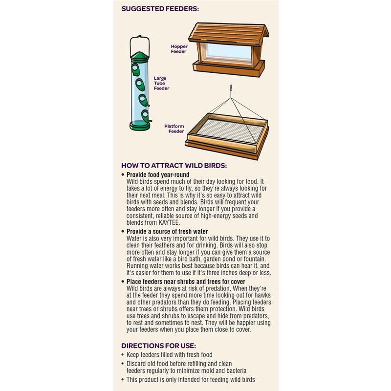 Kaytee Nut & Fruit Blend is a premium mix of healthful seeds and grains with added nuts and fruit pieces to appeal to a great variety of colorful songbirds. Birds require lots of energy for flying, keeping warm and many other daily activities. Kaytee Nut & Fruit Blend offers the right high-energy foods that birds love. You can attract them to your feeder and help them replenish their bodies. Pound for pound, nothing offers more energy than fruit and nuts.