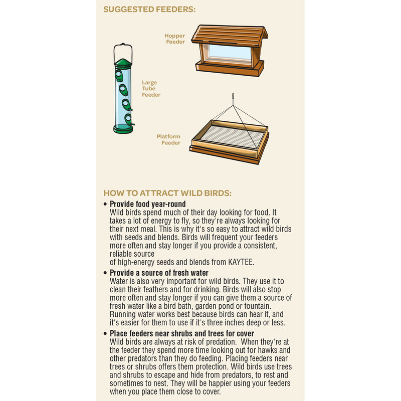 Kaytee Waste Free Blend is a premium mix of hulled sunflower seeds, shelled peanuts for bird health and other appetizing ingredients to attract a variety of birds to your backyard all year long. A concentrated food that lasts longer so feeders won't need to be filled as often. Because there are no sunflower hulls, every bite is 100 percent edible. Birds will even eat fallen seeds - leaving your yard neat and beautiful. Its effortless eating for them and effortless caretaking for you.