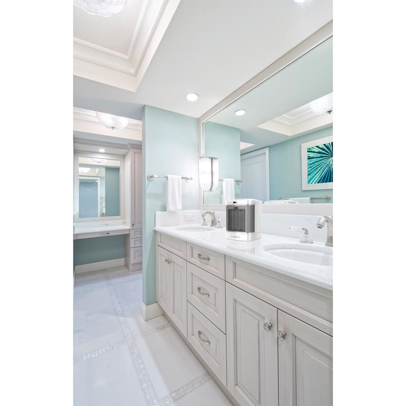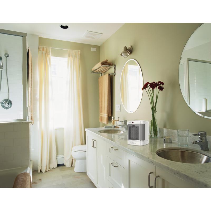 The perfect space heater to warm up your chilly bathroom or any room in your home. Lasko's ceramic bathroom heater is equipped with an ALCI safety plug, especially for bathroom use. Satisfying heating options, including two steady on settings, plus the simple heat button, which provides 1 hour of high heat to warm your bathroom on chilly mornings with one easy tap high heat and low heat, plus the Simple Heat 1 hour timer. Safety features, include automatic overheat protection, self regulating ceramic element, and cool touch exterior. Comes fully assembled. 3 year limited warranty.