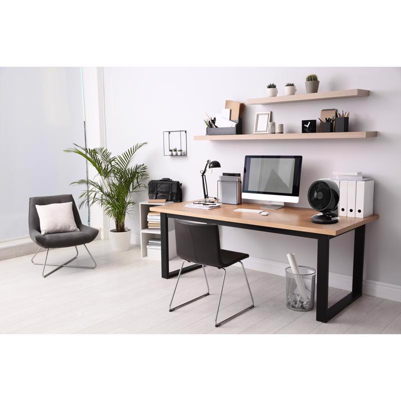 The Whirlwind A12558 black orbital motion air circulator with remote control from lasko features orbital motion that is designed to oscillate vertically and horizontally or both simultaneously for maximum room coverage, features a 60 degree horizontal swing, 90 degree by 60 degree orbital motion or 90 degree vertical lift. This small but mighty fan will move air up to 1150 feet per minute and circulates the air up to 25.6 times per hour in a small room and 13.1 times per hour in medium sized rooms. Use the convenient comfort controls to select from 3 speeds ranging from quiet to powerful. The dark mode feature will automatically turn off the display lights after 5 seconds to create a more pleasant user experience. The multi function remote control will operate this tabletop fan from a distance. Plus, there is storage for the remote on the back of the fan. Equipped with the blue plug, Lasko's trusted safety fuse technology. Come fully assembled with a 1 year limited warranty.
