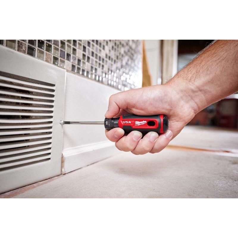 The Milwaukee 3/16" Cabinet 3" Cushion Grip Screwdrivers (USA) are manufactured to give the professional the best-fitting screwdriver with max grip. These screwdriver tips are custom machined to deliver a precise fit and reduce stripping during demanding fastening applications. For added confidence, the tips are laser etched to increase the gripping surface. Manufactured with high-strength boron-infused steel for increased hardness, these screwdrivers stand up to the demands of the site with ultimate durability and life. Providing increased versatility, select screwdrivers include a wrench-ready bolster for added torque and a knurled shank for precision control. Quick identification markings on the handle make it easy to identify screwdriver tip size, including Phillips, cabinet, ECX, slotted, and square. These screwdrivers range in shank sizes from 3 inches to 10 inches.