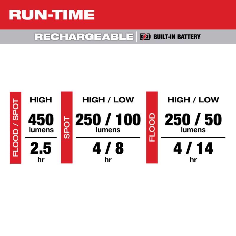 The Milwaukee rechargeable magnetic headlamp and task light offers a detachable, magnetic task light that delivers true view high definition output with spot and flood beam options. Its magnetic light head provides fast and easy detachment from the strap holster while also providing the ability to magnet mount the light for hands-free task lighting. Multiple output levels and three separate magnet surfaces on the light head allow for optimization of output and direction of light in extremely tight spaces. The Milwaukee rechargeable magnetic headlamp and task light built-in battery offer high performance and rechargeable capabilities where compact size is critical.