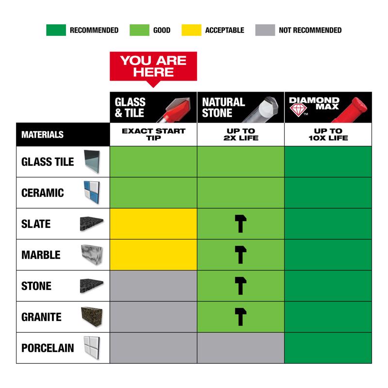 The Milwaukee 4-piece glass and tile drill bit set features an exact start tip for clean holes and minimal bit walking in glass and ceramic tile. Engineered with sharpened carbide, Milwaukee glass and tile bits provide faster tile drilling than standard glass and tile bits. The reinforced carbide head provides increased durability when high-speed drilling into tile and glass. These bits are specifically designed for drilling holes in glass and ceramic tile with drill drivers only and are not recommended for use on porcelain tiles.
