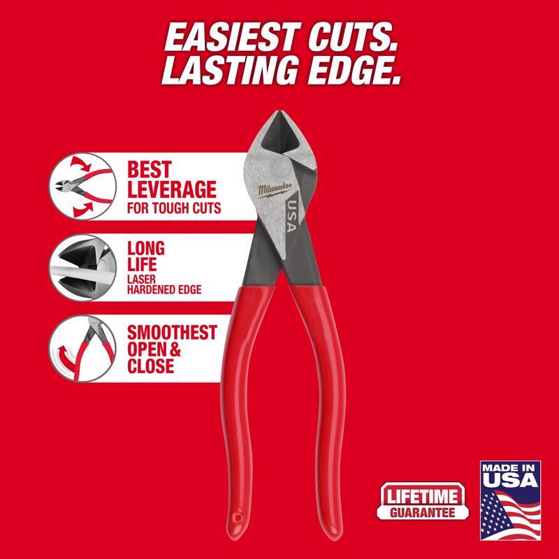 Our Milwaukee Diagonal Cutting Pliers deliver the easiest cuts and a lasting edge for the professional user. Our pliers are designed with an optimized pivot point to provide the best leverage for tough cuts through materials like wires, screws, and other common hardware. Our diagonal cutting pliers deliver the confidence of a long cut life with a laser-hardened edge. Our diagonal cutting pliers are engineered to deliver the smoothest open and close experience from the start, with no break-in period required. The pliers are tether ready and offered in both dipped grips with a split-ring hole. Our Diagonal Cutting Pliers are available in sizes 6-inch, 7-inch, and 8-inch.