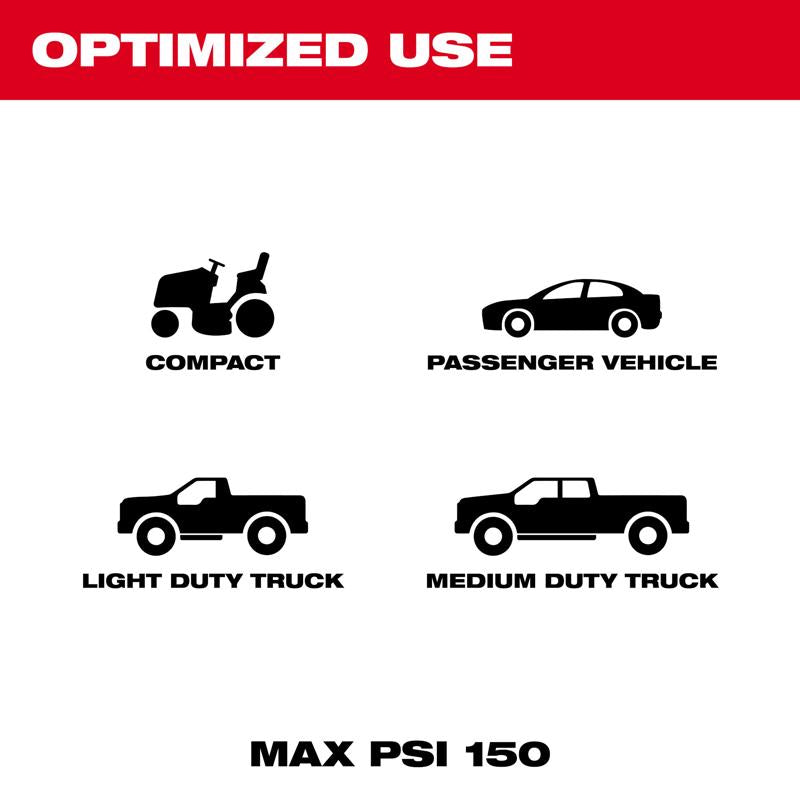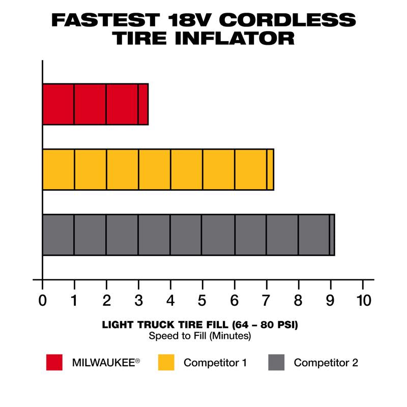 The Milwaukee M18 150 PSI Inflator with 5Ah Battery & Charger Kit includes: (1) 2848-20 M18 Cordless 150 PSI Inflator & (1) 48-59-1850 M18 5.0Ah Battery & Charger Starter Kit. The Milwaukee M18 REDLITHIUM XC5.0 Starter Kit delivers up to 2.5X more runtime, 20% more power and 2X more recharges than standard lithium-ion batteries. The lithium-ion battery pack features superior pack construction, electronics, and performance providing users more work per charge and more work over pack life than any battery on the market. The rechargeable battery also delivers users with 5.0 Amp-hours of runtime. Each battery pack is durably built for heavy-duty use, runs cooler, and performs in climates below 0 degree F/minus 18 degree C. This protection routes water away from the electronics and out of the battery pack, extends the users' battery run-time and life by minimizing heat, and prevents pack failures from vibration or drops. Built-in REDLINK Intelligence protects the battery from overloads, preventing users from damaging their cordless power tools in heavy-duty situations, while the discharge protection prevents cell damage. An integrated temperature Management system and individual cell monitoring help to maximize battery life. FASTEST 18V CORDLESS TIRE INFLATOR. The Milwaukee M18 Inflator delivers fast, accurate, easy inflation with the portability to take anywhere. Optimized for Passenger, Light Truck, and Other Medium Duty tires. Rated to deliver max 150PSI, the high efficiency motor tops-off 33" Light Truck tires in under 1 minute. The True Fill Technology features an Auto-Pressure check that WAITS for the pressure to stabilize, CHECKS the system pressure, and FILLS until desired target is reached. In addition, an Auto Shut-Off feature will stop inflation at selected PSI to prevent overinflation allowing users to set it & forget it. Furthermore, the unit includes 4 PSI memory slots, anti-vibration feet, a 36" inch hose with an all-brass Schrader chuck, and an on-board h