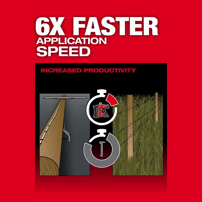 Our Milwaukee M18 Fuel Utility Fencing Stapler delivers unmatched performance in a completely battery-powered solution. By leveraging our nitrogen spring technology, Powerstate brushless motor, and Redlink intelligence, this stapler delivers the power to seat staples into the toughest utility pole and fence post materials. Our M18 Fuel utility fencing stapler provides our users a 6X increase in productivity and a reduction in peak muscle effort compared to manual staple installation. Our cordless stapler is designed for compatibility with our 9 gauge galvanized staples (sold separately) available in three sizes: 1-1/2", 1-/4", 2". When paired with our M18 Redlithium CP3.0 battery pack, this stapler gives users the ability to sink up to 600 staples per charge no gas cartridge required. Our M18 Fuel utility fencing stapler joins the M18 system of over 200 solutions and is compatible with all M18 Redlithium batteries.