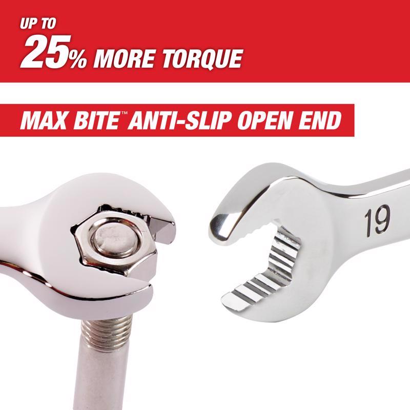 Our Ratcheting Combination Wrenches feature 2.5 deg. of arc swing, allowing our users to work quickly and efficiently in tight spaces. Our mechanic's wrenches feature durable double-stacked pawls in the ratcheting mechanism offer the longest ratchet life and improved access with 144 ratcheting positions. Max-Bite open-end grip improves the ratchet wrench's grip on nuts and bolts, offering 25% more torque than smooth-faced wrenches. Our ratcheting combination wrench set features ink-filled size labels for easy size identification, as well as quick distinction between SAE and metric sets.