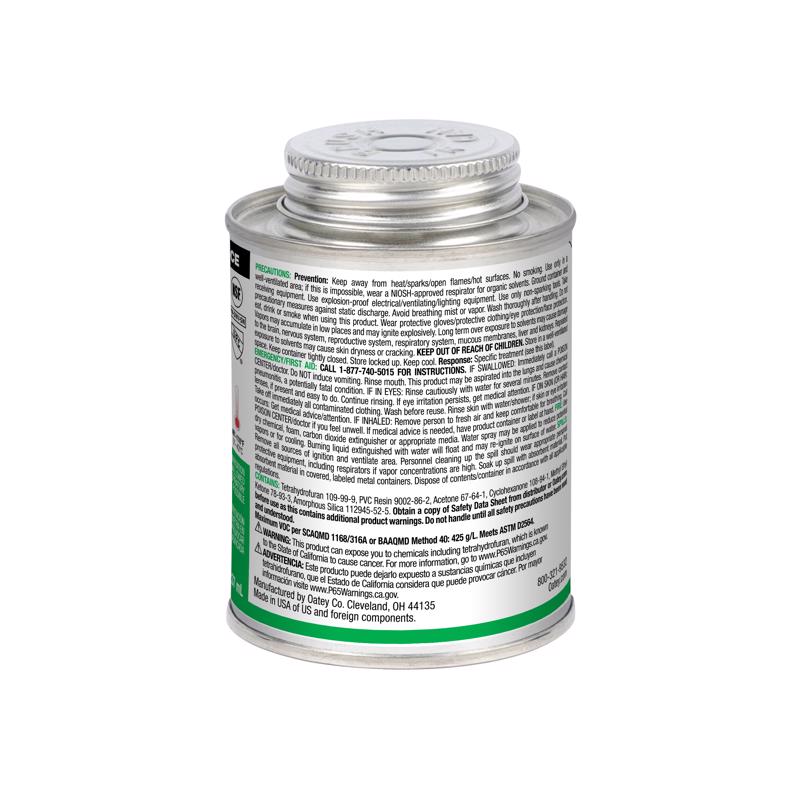 Oatey PVC heavy duty medium set clear cement is recommended for DWV, pressure pipe, potable water and electrical applications. Its thick formula fills gaps in large diameter pipe and loose fitting joints and is easy to apply with included in-lid dauber. This clear, heavy duty, medium set cement can be used to solvent weld all schedules and classes of PVC pipe and fittings with interference fit up to 18 in. diameter for non-pressure and 12 in. diameter for pressure pipes. Oatey products have earned the trust of plumbing professionals for over 100 years.