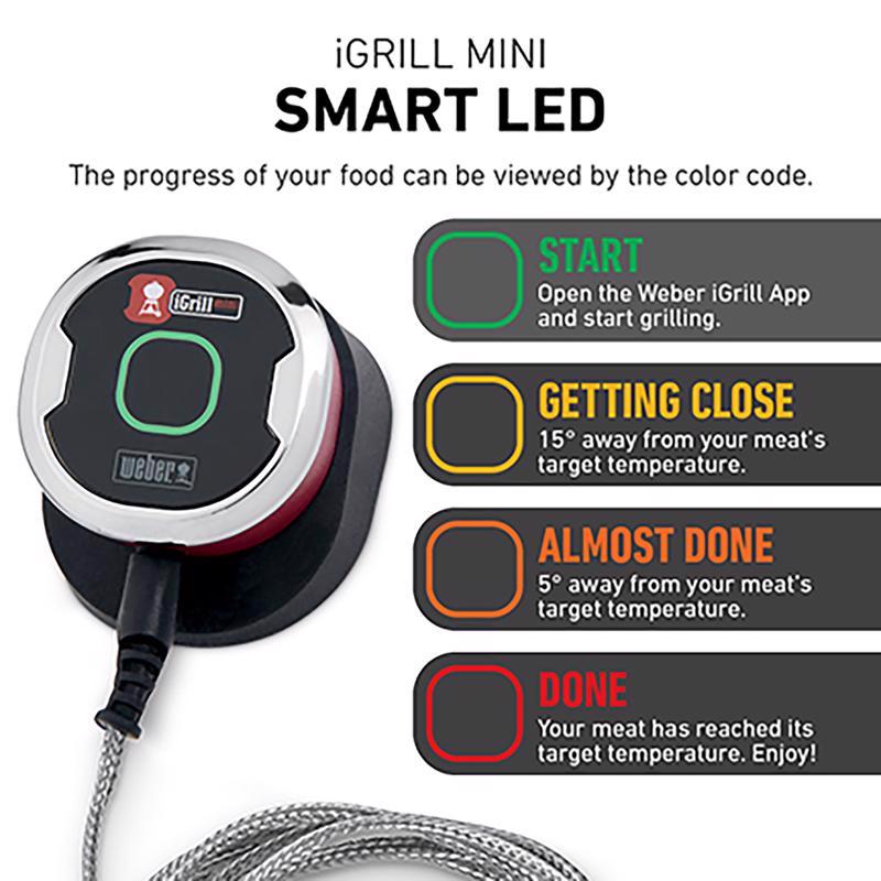 The Weber iGrill Mini offers precision grilling, every time. With 150 hours of battery life, this two-inch magnetic thermometer seamlessly pairs with your mobile device via the Weber iGrill app to immediately alert you once your food has reached your target doneness. The iGrill Mini includes Smart LED technology that guides you through a four-color food progression spectrum, so youll never have to lift the lid on your grill or smoker and interrupt the cooking process. Green means that youre ready to go, yellow indicates that youre 15 degrees from your target temperature, orange signifies that youre within 5 degrees of the target temperature, and red means that your meat is donetime to eat.