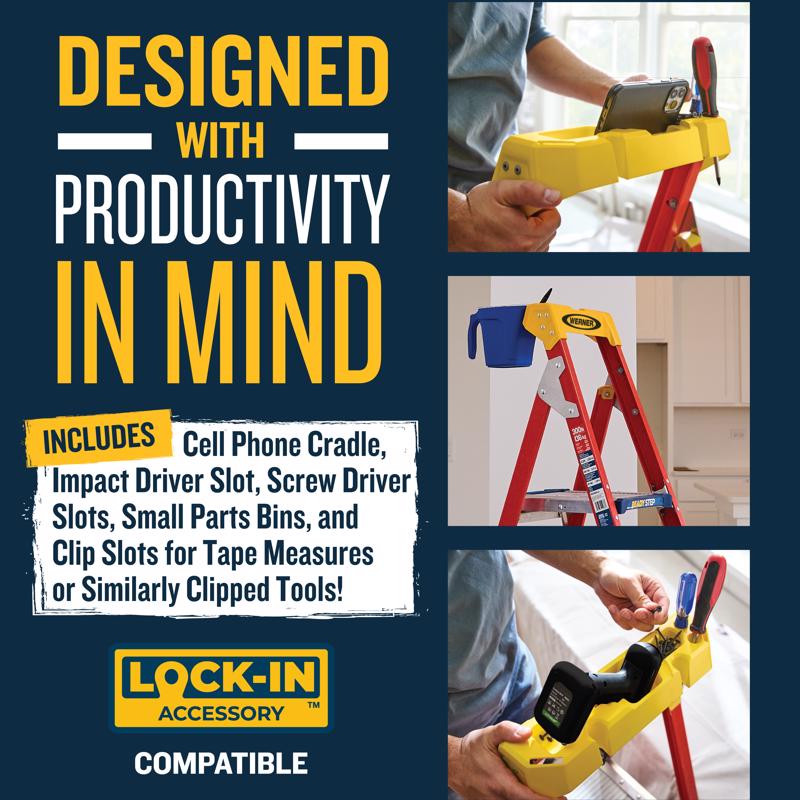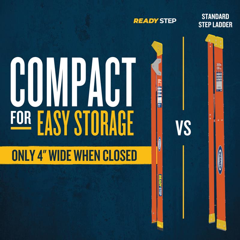 The 5.5-foot Werner Ready Step ladder has a 300-pound load capacity in a compact and lightweight design that is 15 percent less weight than a standard step ladder. The extra-large quick setup platform provides 3X the standing room for added comfort and safety while working at height. One-handed setup allows you to get to work quickly. Engineered for easy handling and storage, it folds to 4 in. when closed. Slip-resistant ft. provide stability, and reinforced Edge bracing offers added durability. Locktop holds an impact driver, screwdriver, tape measure, small parts, and a phone-keeping the most common items within reach. Lockin accessory compatible for expanded organization-easily add a paint cup, job bucket, or job caddy to hold extra materials and small parts.